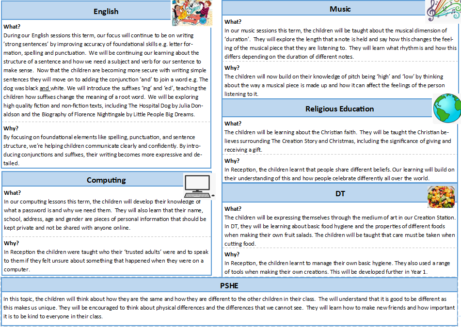 Welcome to Year One. We are delighted to be teaching your child this academic year and to deliver an exciting and enriching curriculum that inspires them to be lifelong learners. Our aim is to ensure that your child gets the best out of the early years in their school life. On this page you will find general information about Year One but also ways you can help at home. At the bottom of the page you will find learning updates and topic webs explaining what your child will be doing every half term.
