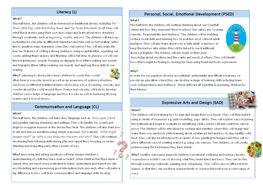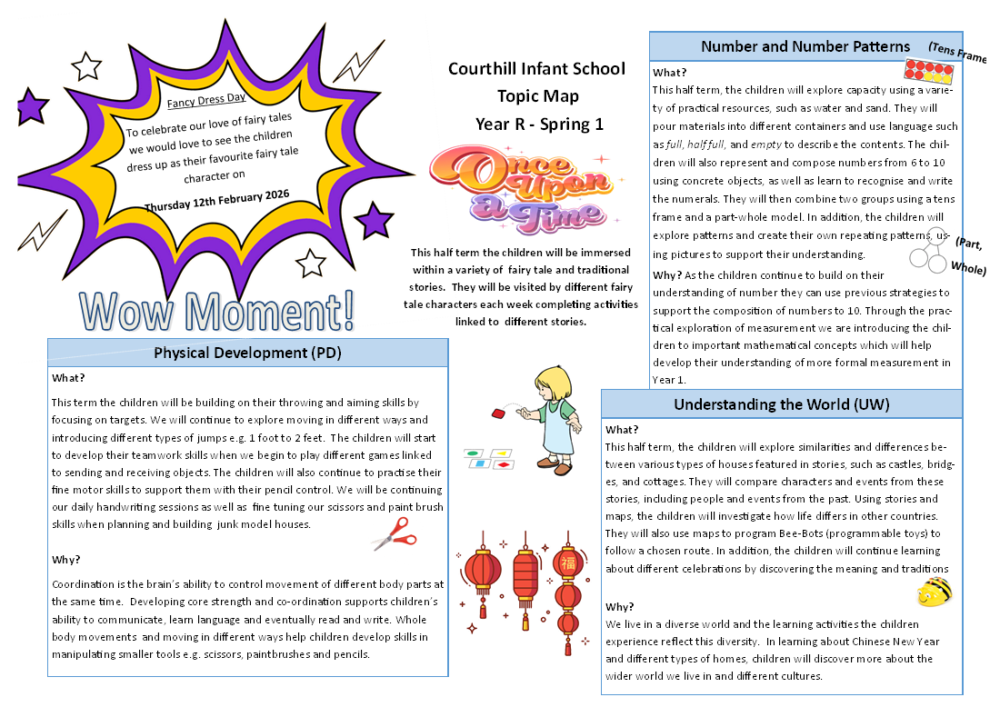At Courthill Infant School we deliver an exciting and enriching curriculum that inspires them to be lifelong learners. Our aim is to ensure that your child gets the best out of these early stages in their school life. On this page you will find general information about Reception but also ways you can help at home. At the bottom of the page you will find learning updates and topic webs explaining what your child will be doing every half term.
